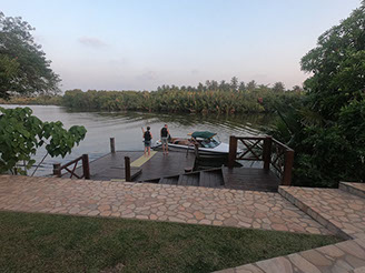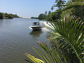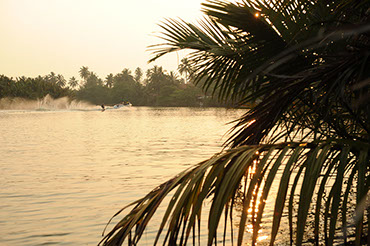 by palm trees and the dense vegetation. The water is